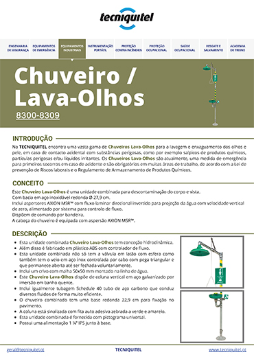 O Chuveiro / Lava-Olhos 8300-8309 é um equipamento de emergência combinado projetado para a descontaminação do corpo, rosto e olhos em situações de risco químico.