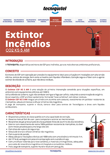 O extintor CO2 KS 5 AM é uma solução de primeira intervenção concebida para situações específicas, especialmente em ambientes com equipamentos elétricos até 1000 V.
