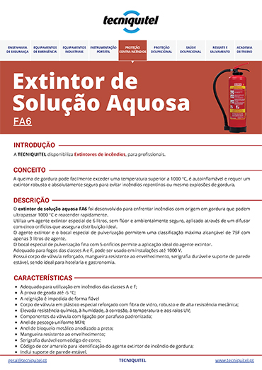 O extintor de solução aquosa FA6 foi desenvolvido para enfrentar incêndios com origem em gordura que podem ultrapassar 1000 °C e reacender rapidamente.