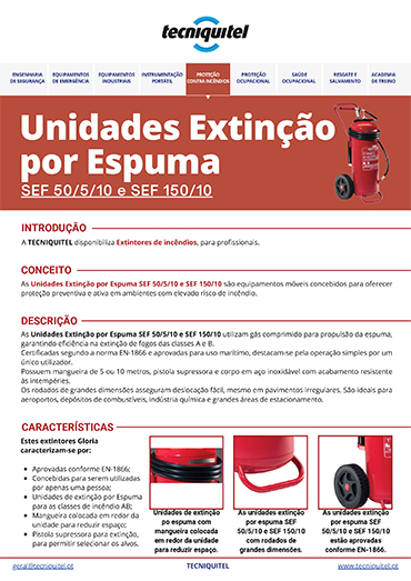 As unidades extinção por espuma SEF 50/5/10 e SEF 150/10 são equipamentos móveis concebidos para oferecer proteção preventiva e ativa em ambientes com elevado risco de incêndio.