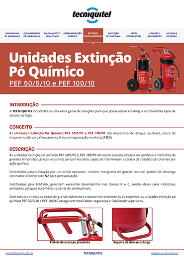 As unidades extinção pó químico PEF 50/5/10 e PEF 100/10 oferecem elevada eficácia no combate a incêndios de grandes dimensões, graças ao uso de pó químico seco, capaz de interromper a cadeia de reações das chamas por ação química.