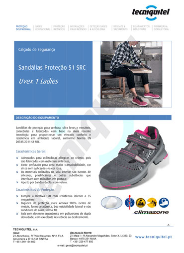A sandália de segurança S1 SRC ESD UVEX 1, para além de ser versátil, de estilo desportivo, tem peso reduzido. Disponível nos tamanhos 35 a 43.