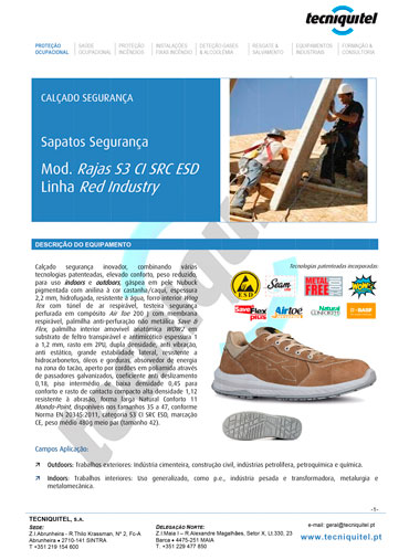 Este sapato de segurança S3 CI SRC ESD RAJAS inovador está classificado como calçado de segurança da classe S3 CI SRC ESD. Além disso, combina várias tecnologias patenteadas. Tem elevado conforto, peso reduzido e está adequado para uso indoors e outdoors.