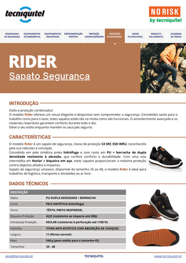 O sapato de segurança S3 SRC ESD WRU RIDER está disponível do tamanho 35 ao 48.
