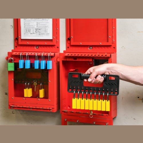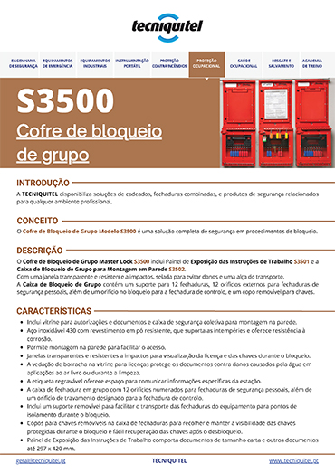 O cofre de bloqueio de grupo Modelo S3500 é uma solução completa para segurança em procedimentos de bloqueio. Inclui painel de exposição das instruções de trabalho (S3501) e caixa de bloqueio de grupo para montagem em parede (S3502).