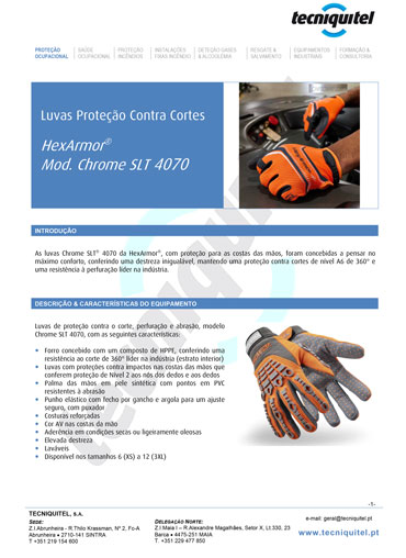A luva de proteção HexArmor® Chrome SLT® 4070 não só tem cor AV nas costas da mão, como também inclui punho elástico com fecho em Velcro® para um ajuste seguro com puxador.