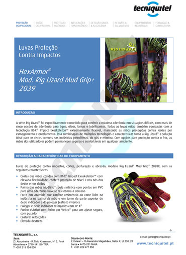 A luva de proteção HexArmor® Rig Lizard 2039 tem as costas das mãos cosidas com IR-X® Impact Exoskeleton™ com elevada flexibilidade, confere proteção ANSI/ISEA 138 de Nível 2 nos nós dos dedos e nos dedos.