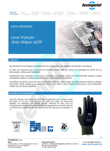 A Luva de Proteção Unipur 6639 está de acordo com à norma europeia EN-388 e possui marcação CE, sendo uma solução confiável para proteger as mãos contra riscos de corte, abrasão e sujidade, mantendo a eficiência e segurança no trabalho diário.