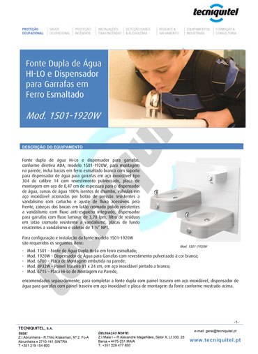 Para configuração e instalação da fonte e dispensador de água para garrafas modelo 1501-1920W são requeridos os seguintes componentes: