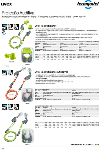 Todas as embalagens dos tampões auriculares reutilizáveis uvex xact-fit planet são feitas a partir de cartão reciclado. Além disso, cumprem a norma EN 352-2 e tem uma atenuação de 26 dB.