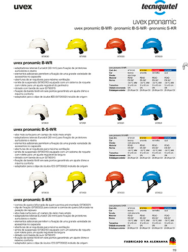 O capacete de segurança Uvex pronamic B-S-WR tem uma aba mais curta para um campo de visão mais amplo. Possui adaptadores laterais Euroslot (30 mm) para fixação de protetores auriculares e viseira.
