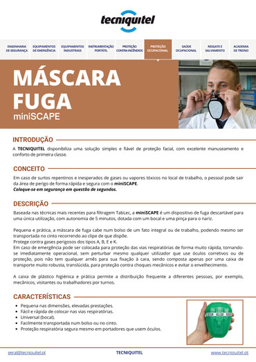 A máscara de fuga miniSCAPE é um dispositivo de emergência concebido para permitir a saída rápida e segura de áreas contaminadas por gases ou vapores tóxicos.
