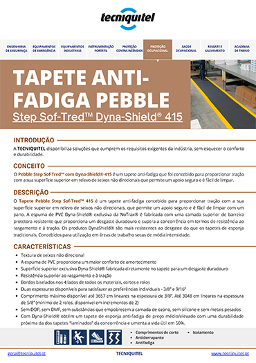 O tapete antifadiga Pebble Step Sof-Tred™ w/Dyna-Shield® 415 está concebido para proporcionar tração com a sua superfície superior em relevo de seixos não direcionais, que permite um apoio seguro e fácil de limpar.
