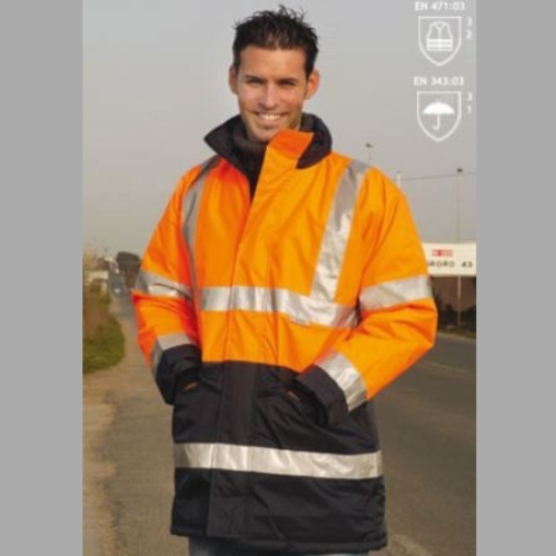 O interior possui forro em nylon e enchimento em poliéster de 180 g/m², proporcionando conforto térmico. O fecho frontal de correr é protegido por pestana, garantindo maior proteção. A zona inferior em azul-marinho ajuda a disfarçar sujidades, mantendo um aspeto profissional. Classificação de alta visibilidade classe 3.