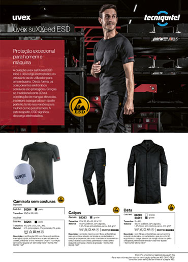 A coleção uvex suXXeed ESD inibe a descarga eletrostática do vestuário ou do utilizador para uma máquina. Desta forma, os componentes eletrónicos sensíveis são protegidos.
