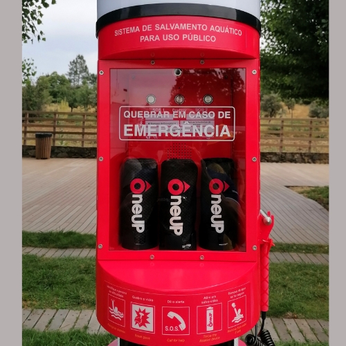 Sistema de salvamento aquático para uso público, a tecnologia que salva. Destinado à promoção das condições de segurança em espaços públicos de lazer com planos de água, o totem SOS OneUp náutico, tem enquadramento legal na vertente da Proteção Civil.