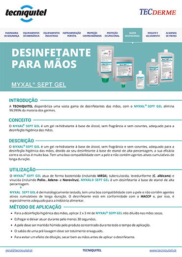 A TECNIQUITEL disponibiliza o desinfetante para as mãos MYXAL SEPT GEL que elimina 99,999% da maioria dos germes.