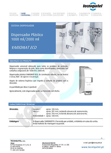 O Doseador Plástico para Embalagens de 1L e 2L VARIOMAT ECO foi desenvolvido para uso exclusivo com embalagens da gama VARIOMAT ECO, assegurando total compatibilidade e eficiência. O produto é fornecido com todo o material necessário para montagem, embalado em caixa de cartão resistente.