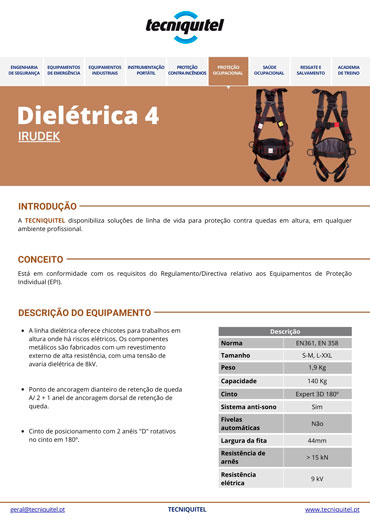 O arnês de segurança DIELECTRIC 4 é a solução definitiva para quem procura máxima em segurança, conforto e funcionalidade em trabalhos em altura, especialmente em ambientes com risco elétrico.