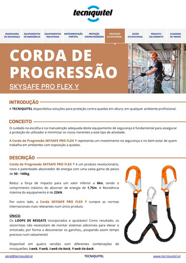 Além disso, suporta sempre um impacto máximo de menos de 6 kN num comprimento máximo do absorvedor de 1,75m (5,7 pés). A resistência final ao impacto de 22KN obtida antes e depois do impacto é excecional. Por outro lado, a corda de progressão SKYSAFE PRO FLEX Y cumpre as normas internacionais mais relevantes num único produto.