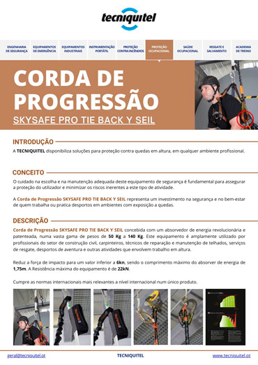 Corda de progressão SKYSAFE PRO TIE BACK Y SEIL concebida com absorvedor de energia revolucionária e patenteada, com uma vasta gama de pesos de 50 Kg a 140 Kg. Resiste sempre a um impacto máximo inferior a 6 kN com um comprimento máximo do absorvedor de 1,75 m. A resistência final ao impacto de 22KN obtida antes e depois do impacto é excecional.
