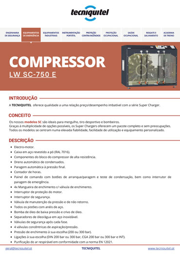 A Tecniquitel destaca-se pela oferta de soluções de excelência na área de ar respirável, combinando qualidade com uma relação preço-desempenho imbatível. Entre os equipamentos de referência está o compressor LW SC-750 E, integrante da reconhecida série Super Charger.