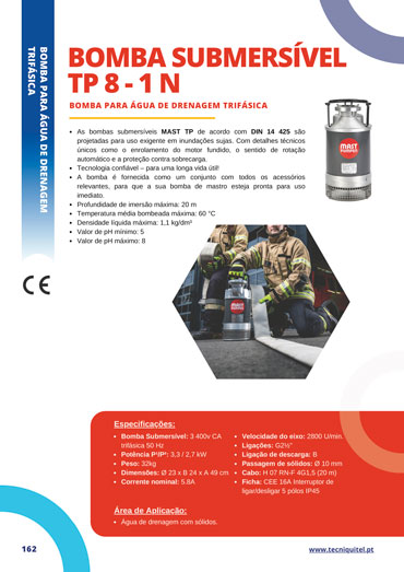 A eletrobomba submersível TP 8 – 1 N está equipada com um conjunto de acessórios relevantes, para que a sua bomba de mastro esteja pronta para uso imediato. Além disso, opera a profundidades de imersão máxima de 20 m, temperatura média bombeada máxima de 60 °C e densidade líquida máxima: 1,1 kg/dm³.