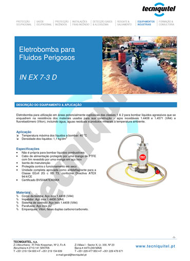 Eletrobomba para fluídos perigosos IN EX 7-3 D de utilização em áreas potencialmente explosivas das classes 1 & 2.