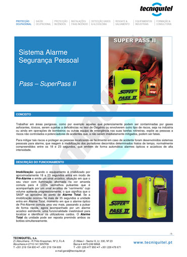 O sistema alarme segurança pessoal SUPERPASS II é um alarme automático que deteta a ausência de movimento e possui um botão de pânico manual. Ele ativa automaticamente quando a chave é removida (podendo a chave vir com informações e correia ajustável). Pressionar o botão de pânico ativa o alarme total.