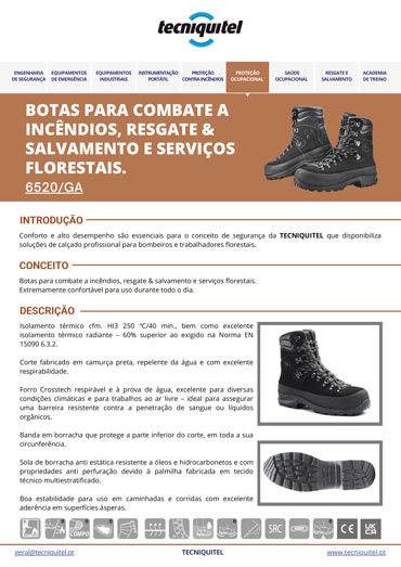 A bota 6520/GA WILDFIRE PRO foi desenvolvida para combate a incêndios, resgate, salvamento e serviços florestais. Garante excelente estabilidade para caminhar e correr, bem como elevada aderência em terrenos irregulares.
