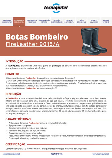 A bota para bombeiro FireLeather 9015/A é a excelência em calçado para Bombeiros. A FireLeather 9015/A é uma bota para bombeiro em pele genuína hidrofugada, pigmentada à cor preta, forro interior integral em pele natural, cano alto e biqueira de aço 200 Joules.