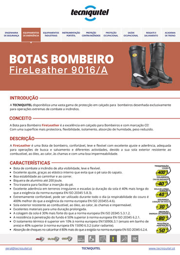 A bota para bombeiro FireLeather 9016/A é a excelência em calçado para Bombeiros com marcação CE. Com uma superfície mais protetora, flexibilidade, isolamento, absorção de humidade e peso reduzido.