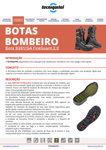 Possui calcanhar com absorção de energia 80% superior ao padrão europeu, indicador de desgaste da sola e fecho anatómico deslizante com velcro. Flexores almofadados proporcionam liberdade de movimento, e a biqueira de alumínio aliada à proteção frontal contra abrasão asseguram durabilidade. Impermeável, antiderrapante, antiestática, resistente ao calor, fogo e óleos, a FireGuard 2.0 combina leveza, robustez e alta visibilidade.
