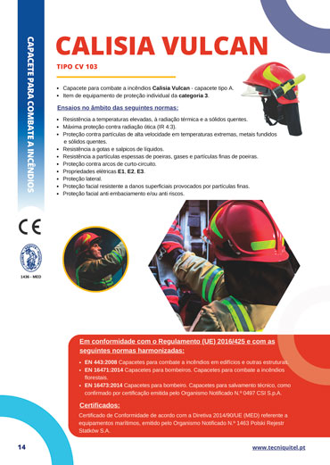 Este equipamento garante o mais alto nível de segurança, mesmo nas condições mais difíceis. Capacete do tipo A para combate a incêndios. Item de equipamento de proteção individual da categoria 3. O capacete para bombeiro CALISIA VULCAN 103 está em conformidade com o Regulamento (UE) 2016/425.
