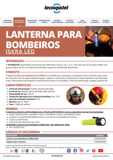 A lanterna para incêndios ISKRA LED está concebida para utilização na proteção contra incêndios. Assim como em zonas de risco de explosividade de gases, vapores e névoas (G) ou poeiras (D). Corpo resistente, não inflamável e leve. Esta lanterna altamente especializada atende a rigorosas normas de segurança e desempenho, sendo certificada para utilização em ambientes potencialmente explosivos.