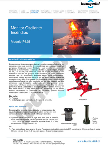 Monitor portátil oscilante modelo P625 está projetado para combate a incêndios, para arrefecimento de estruturas e/ou para controlo de emergências que envolvam matérias perigosas. Pode ser utilizado para projeção de água/espuma. Possibilita movimento de oscilação horizontal automático para varrimento de áreas.