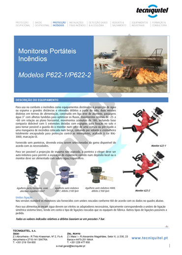 Os monitores portáteis Modelos P622-1 / P622-2 são equipamentos destinados à projeção de água ou espuma para o combate a incêndios a grandes distâncias. Têm elevados débitos a partir do solo, existindo duas versões distintas em termos de alimentação. Construído em liga leve de alumínio, passagens água 3” com alhetas fundidas para otimizar os fluxos. Além disso, dispõem movimentos zenitais de -25º a +80º em relação ao plano horizontal, movimentos azimutais de 180º.
