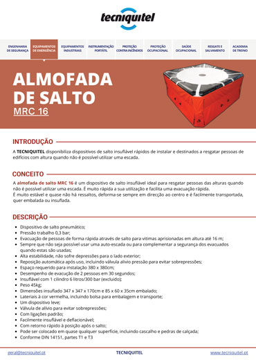 A Almofada de Salto MRC16 possui válvula de alívio contra sobrepressões, reposiciona-se automaticamente após cada salto e permite a evacuação de até duas pessoas em apenas 30 segundos, cumprindo as normas DIN 14151. Uma solução prática, eficaz e confiável para operações de emergência.