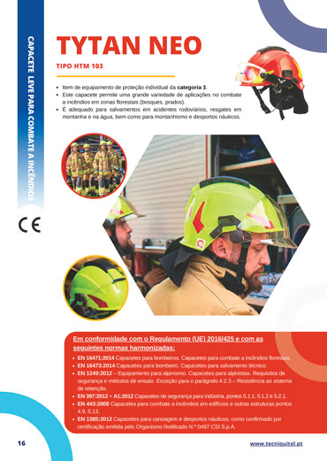 Capacete considerado como equipamento de proteção individual da categoria 3. Além disso, o TYTAN NEO permite uma grande variedade de aplicações no combate a incêndios em zonas florestais (bosques, prados). Também está adequado para salvamentos em acidentes rodoviários, resgates em montanha e na água, bem como para montanhismo e desportos náuticos.