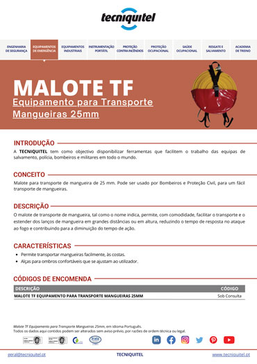 O MALOTE TF assegura comodidade ao utilizador, contribuindo para maior agilidade e eficácia no ataque inicial ao fogo. Fabricado com materiais resistentes e duradouros, garante confiabilidade em operações intensas. É a solução prática e robusta para aumentar a segurança e melhorar a performance no transporte de mangueiras.