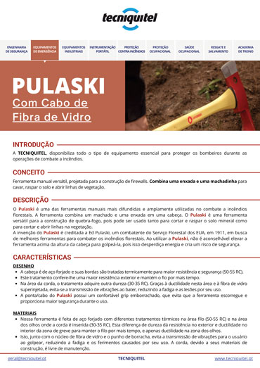 Criado em 1911 por Ed Pulaski, combatente do Serviço Florestal dos EUA, o Pulaski com cabo em fibra de vidro tornou-se referência mundial, sendo amplamente utilizado por brigadistas e profissionais que atuam em áreas de risco.