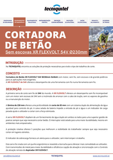 A cortadora de betão sem escovas XR FLEXVOLT 54V Ø230mm é a primeira serra de corte sem fio de 54V do mundo, oferecendo potência e desempenho equivalentes a uma máquina a gasolina, mas sem cabos, fumos ou manutenção complexa.