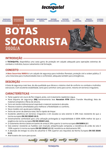 A bota para socorrista 9600/A é um calçado de segurança desenvolvido para incêndios florestais, emergências, proteção civil e ordem pública.